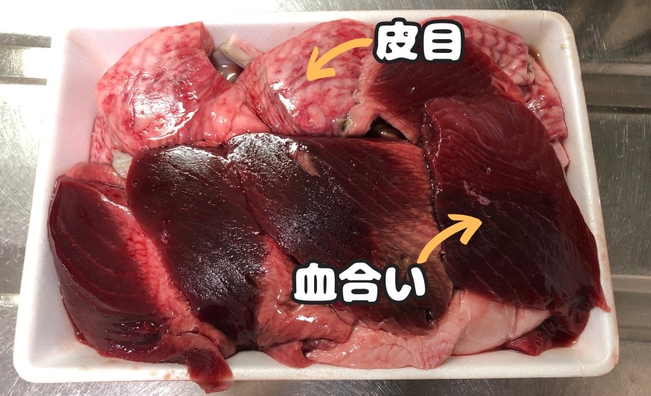 身は白や薄ピンク、アラは血合いが多く真っ赤です。